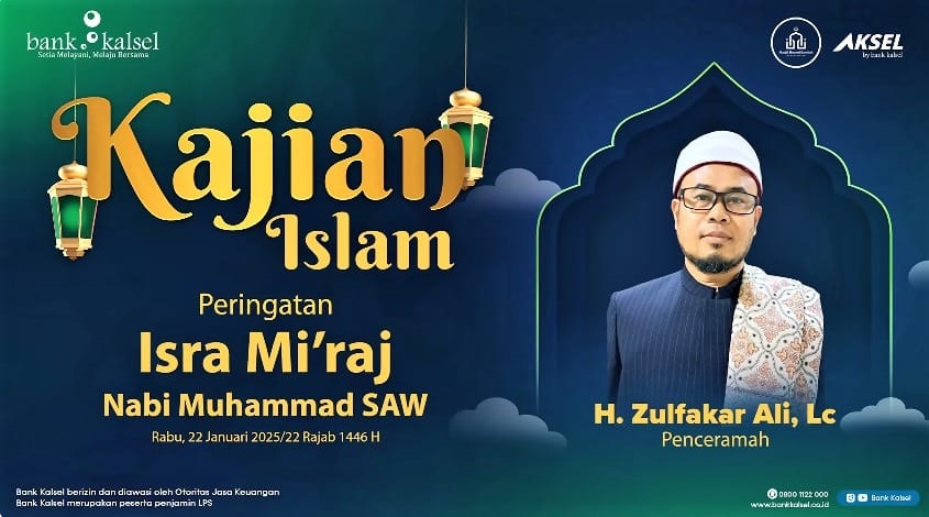 BANJARMASIN – Bank Kalsel menggelar Peringatan Isra Miraj Nabi Muhammad SAW dengan menghadirkan penceramah H Zulfakar Ali Lc pada Rabu (22/1) atau 22 Rajab 1446 H.