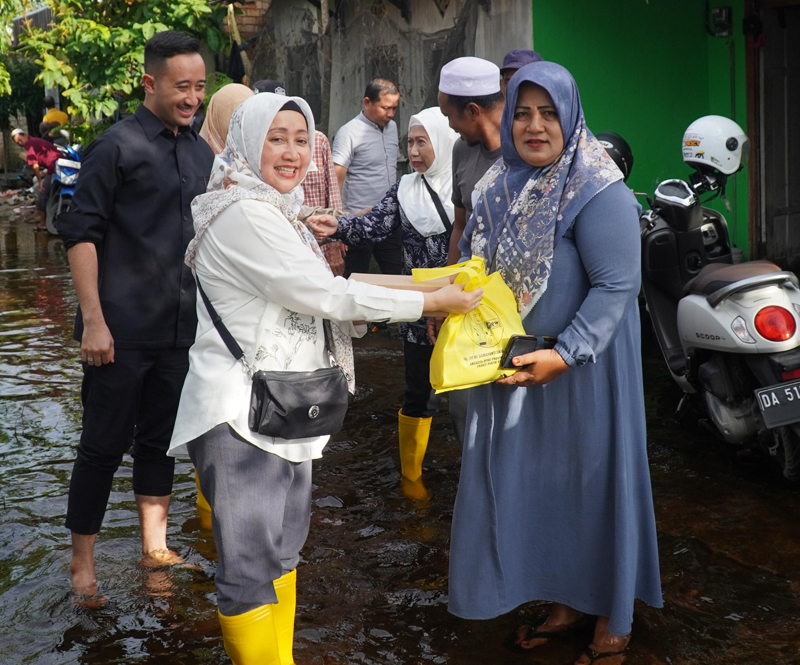 BANJARMASIN- Anggota Dewan Perwakilan Rakyat Daerah (DPRD) Provinsi Kalimantan Selatan (Kalsel) Hj Dewi Damayanti Said memberikan bantuan sembako kepada warga Kota Banjarmasin yang terdampak air pasang.