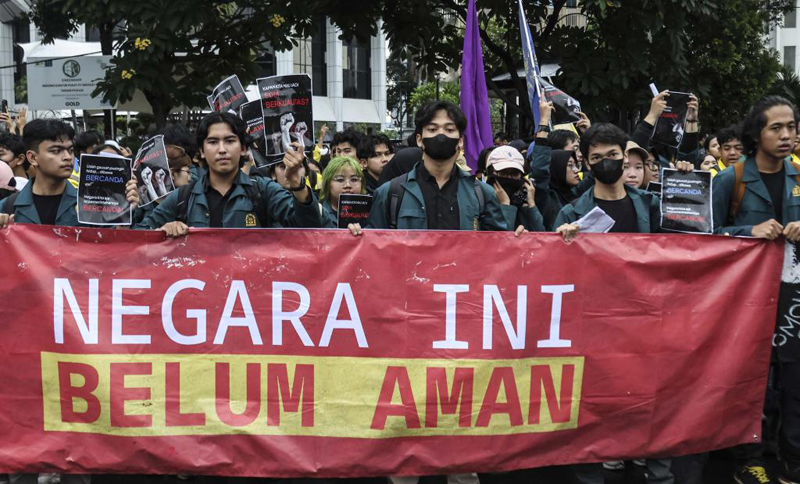 Dari Surabaya dilaporkan, sebanyak lima orang mahasiswa massa aksi ‘Indonesia Gelap’ ditangkap pihak kepolisian saat demonstrasi di depan DPRD Jatim Surabaya, Senin (17/2).