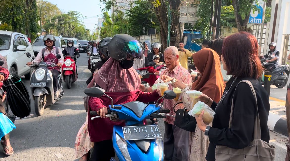 BANJARMASIN- Komunitas wartawan DPRD Kalsel bersama Sekretariat DPRD setempat membagikan takjil kepada warga yang melintas di Jalan Lambung Mangkurat tepatnya depan Gedung DPRD Kalsel.
