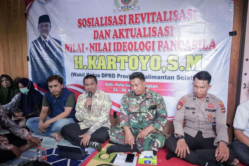 HSS – Wakil Ketua DPRD Provinsi Kalimantan Selatan, H. Kartoyo, S.M., menggelar kegiatan Sosialisasi Revitalisasi dan Aktualisasi Nilai-nilai Ideologi Pancasila (SOSREV) di Desa Pakan Dalam, Kecamatan Daha Utara, Kabupaten Hulu Sungai Selatan, Jumat (25/04).