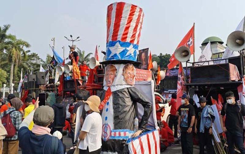 “Jadi itu menyimbolkan Trump sebagai kepala negara, khususnya adalah negara imperialis atau negara kapitalis. Yang mereka dengan mudah bisa mengatur ekonomi dunia dengan keputusan-keputusannya yang dibuat,” kata Sunarno, Kamis (1/5), kepada CNNIndonesia.com.
