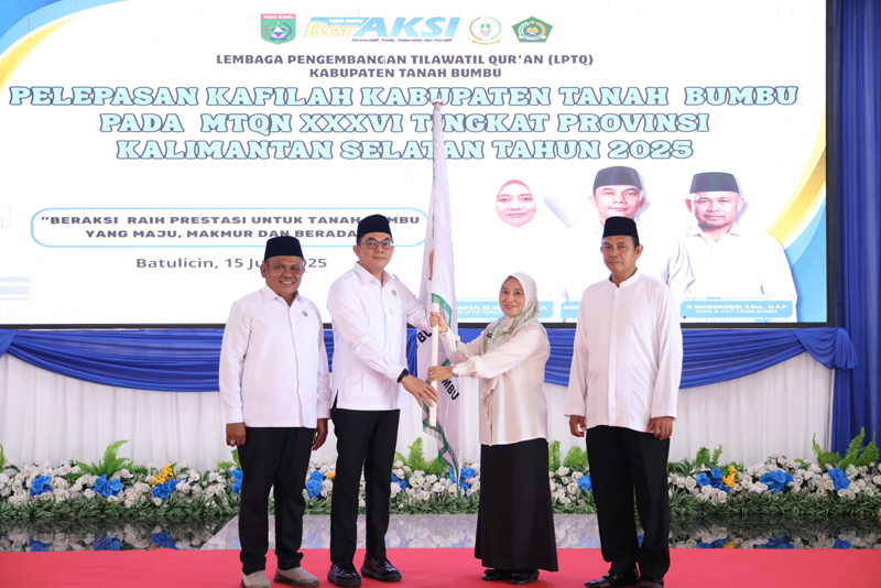 BATULICIN-Bupati Tanah Bumbu, Andi Rudi Latif, secara resmi melepas Kafilah Kabupaten Tanah Bumbu yang akan berlaga di Musabaqah Tilawatil Qur’an Nasional (MTQN) ke-36 tingkat Provinsi Kalimantan Selatan. Pelepasan berlangsung di Pendopo Kantor Bupati, Minggu (15/6/2025).