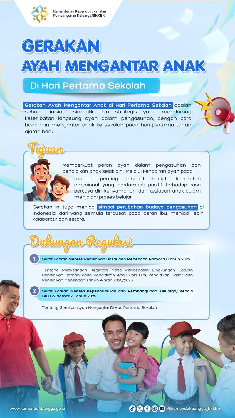 “Keterlibatan ayah sangat penting dalam proses tumbuh kembang anak secara optimal, baik dari segi emosional, psikologis maupun sosial, salah satu upaya adalah dengan melibatkan peran ayah untuk mengantar anak ke sekolah, dan dengan adanya Partisipasi ayah dalam pendidikan anak sejak hari pertama sekolah merupakan bentuk keteladanan yang akan membentuk karakter generasi masa depan,” ujarnya Via Whatsapp.