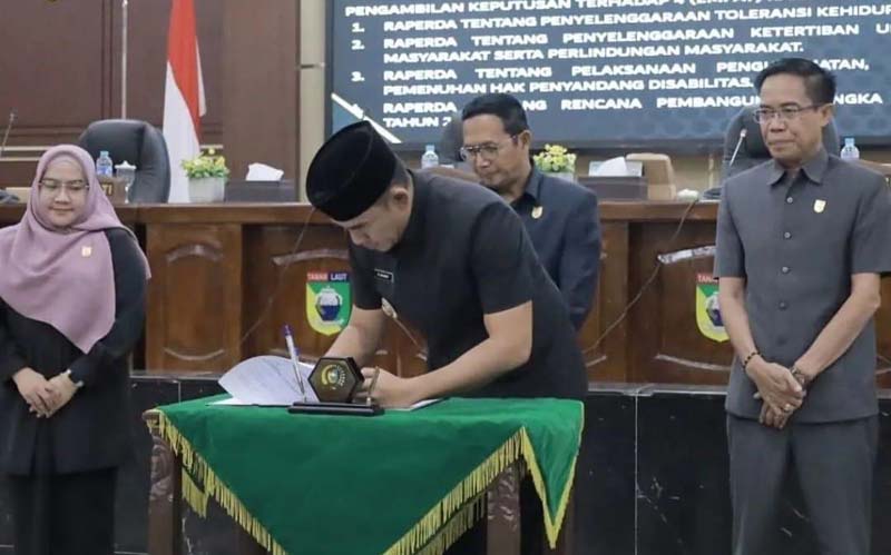 Bupati Tanah Laut (Tala), H Rahmat Trianto saat menandatangani dokumen Perda yang baru disahkan DPRD setempat.
