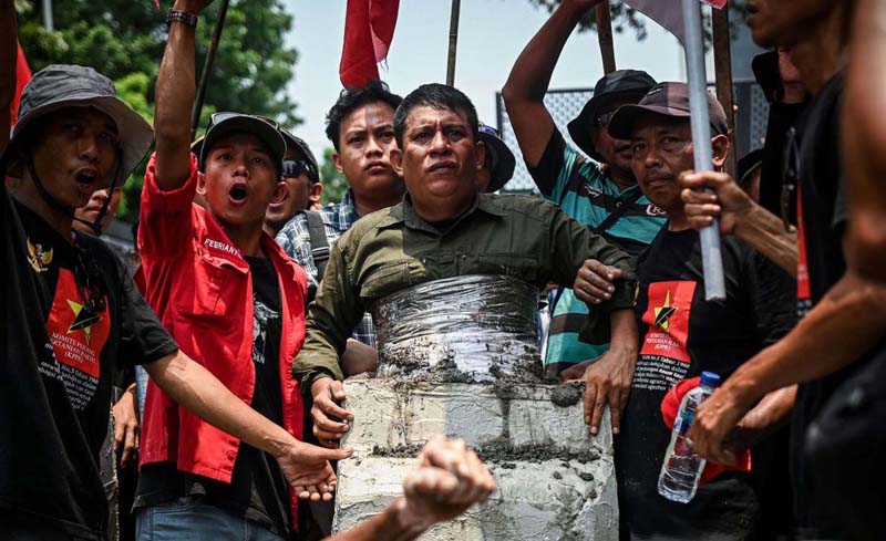 MENGECOR TUBUH – Pengunjuk rasa menggelar teatrikal mengecor tubuh saat aksi Hari Tani Nasioanl ke-65 di Jalan Merdeka Selatan, Rabu (24/9). Serikat Petani Indonesia dari sejumlah daerah menggelar unjuk rasa menuntut pemerintah agar mewujudkan reformasi agraria demi kesejahteraan petani dan kedaulatan pangan bagi rakyat.