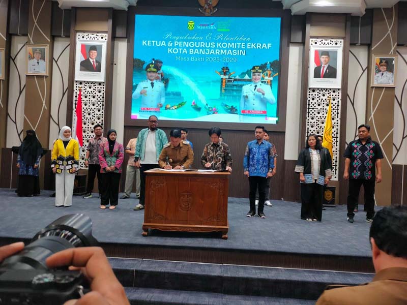 Wali Kota Banjarmasin, H. Muhammad Yamin HR, mengukuhkan dan melantik Ketua beserta jajaran Pengurus Komite Ekonomi Kreatif (Ekraf) Kota Banjarmasin masa bakti 2025–2029. (foto:mb/ist)