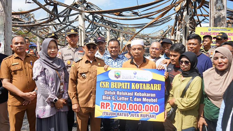 KOTABARU – Bupati Kotabaru H Muhammad Rusli SSos menyampaikan rasa duka sekaligus menyerahkan bantuan CSR Bank Kalsel kepada 167 kios pedagang terdampak musibah kebakaran di Pasar Kemakmuran, berupa uang senilai total Rp 700 juta, Selasa (7/10).