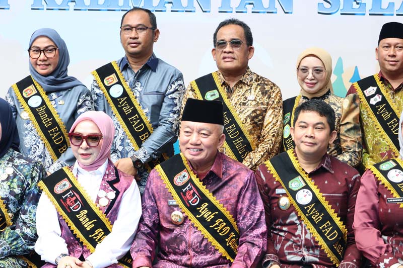 DIKUKUHKAN-Bupati HSU H Sahrujani dan Ketua PKK HSU, dikukuhkan Gubernur Kalsel H Muhidin menjadi Ayah Bunda FAD kabupaten HSU, dan berfoto bersama dengan ayah dan bunda se Kalsel. (foto:mb/ist)
