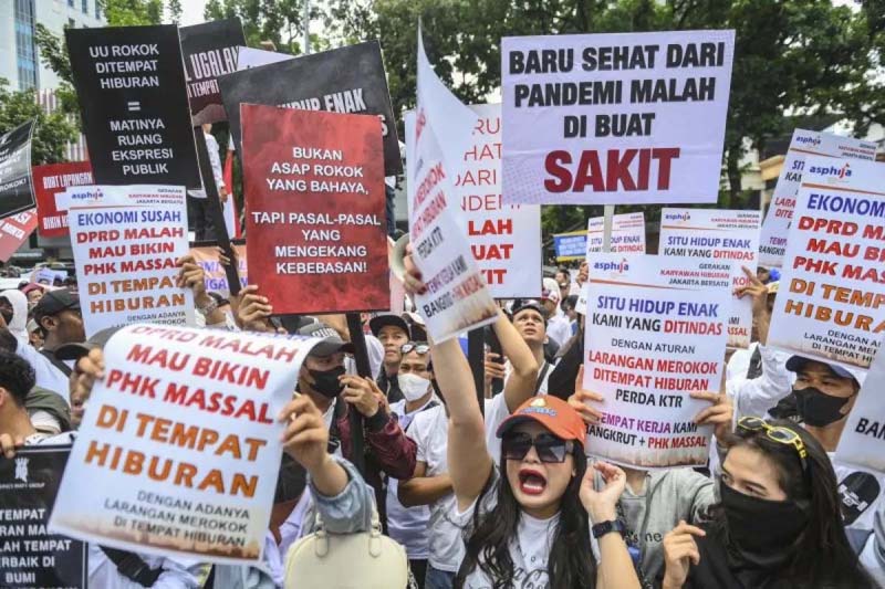 UNJUK RASA – Sejumlah pekerja tempat hiburan yang tergabung dalam Gerakan Karyawan Hiburan Jakarta Bersatu melakukan aksi unjuk rasa di depan Gedung DPRD Jakarta, Selasa (14/10). Dalam aksinya mereka menolak Rancangan Peraturan Daerah (Raperda) Kawasan Tanpa Rokok (KTR) di tempat hiburan malam, karena dianggap berpotensi mengurangi jumlah pengunjung sehingga berdampak pada bisnis hiburan.
