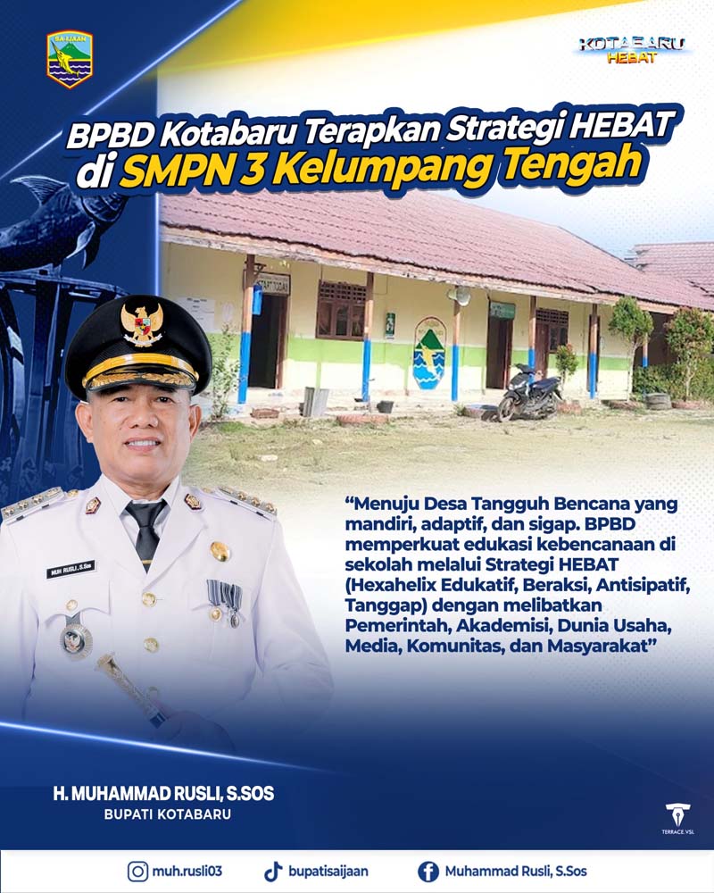 Strategi HEBAT menjadi model pendekatan hexahelix yang mengedepankan kerja sama berbagai pihak. Melalui strategi ini, BPBD Kotabaru juga mendorong keterlibatan aktif instansi pemerintah, lembaga pendidikan, pelaku usaha, dan komunitas lokal dalam memperkuat ketahanan masyarakat terhadap bencana. (ebet/mb03)