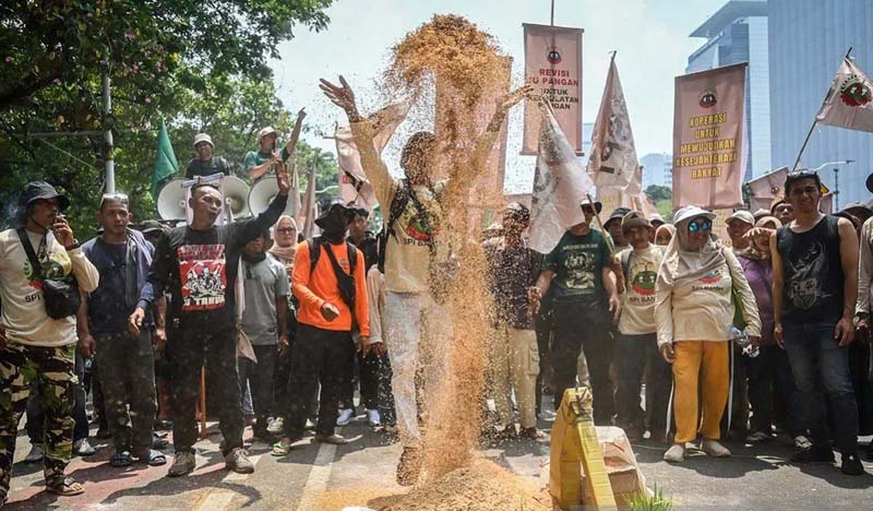 AKSI HARI PANGAN – Pengunjuk rasa melakukan aksi Hari Pangan Sedunia di Jalan Medan Merdeka Selatan, Jakarta, Kamis (16/10). Aksi tersebut bertujuan untuk menegaskan kembali bahwa reforma agraria adalah sebuah kunci untuk mewujudkan kedaulatan pangan di Indonesia.