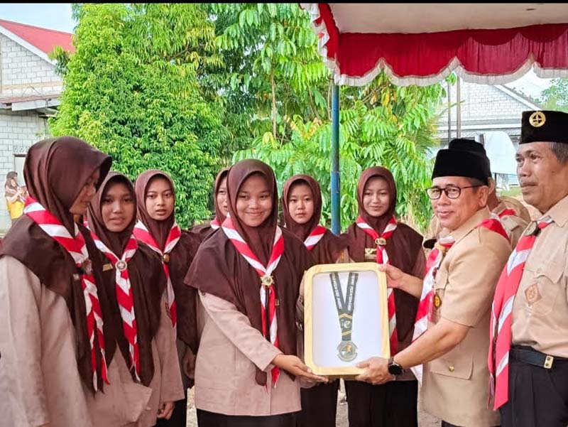 PENGHARGAAN – Pj Sekda Banjar H Ikhwansyah menyerahkan penghargaan kepada Tim Pramuka Putri Pondok Pesantren Annajah Cindai Alus Martapura yang berhasil meraih predikat Regu Teladan (The Role Model Scout Master) pada ajang Jambore Pramuka Muslim Sedunia (World Muslim Scout Jambore) di Bumi Perkemahan Cibubur, Jakarta 9–14 September 2025. (foto:mb/ist)