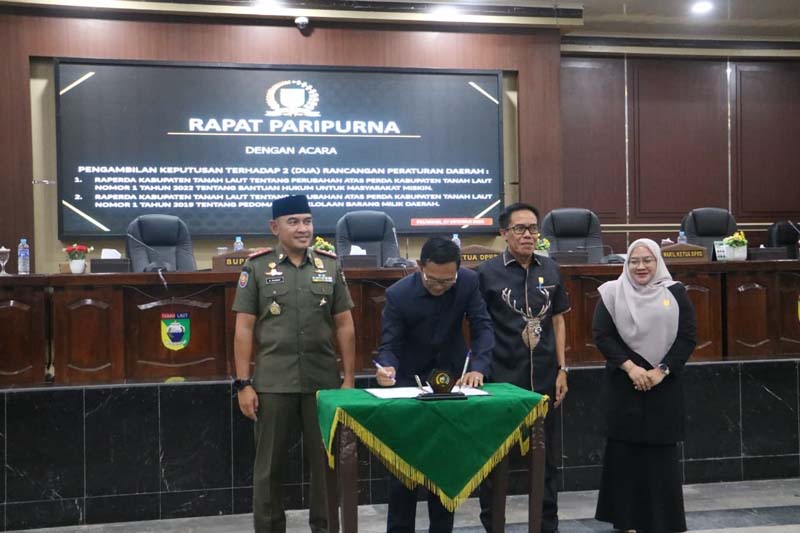PELAIHARI – Pemerintah Kabupaten Tanah Laut (Tala) bersama DPRD Tala resmi menetapkan dua Rancangan Peraturan Daerah (Raperda) menjadi Peraturan Daerah (Perda) dalam Rapat Paripurna yang digelar di Gedung DPRD Tala, di Pelaihari, Senin (27/10).
