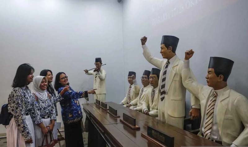 SUMPAH PEMUDA – Sejumlah siswa mengamati diorama kongres pemuda seusai mengikuti upacara peringatan Hari Sumpah Pemuda di Museum Sumpah Pemuda, Jakarta, Selasa (28/10). Museum dan Cagar Budaya Kementerian Kebudayaan menggelar upacara untuk memperingati Hari Sumpah Pemuda ke-97 sebagai bentuk penghormatan atas semangat para pemuda.