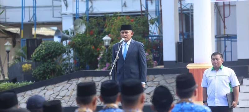 Selaku Irup, Bupati Tala, H Rahmat Trianto membacakan sambutan tertulis Menteri Pemuda dan Olahraga (Menpora) RI, Erick Tohir, di Halaman Kantor Bupati Tala, di Pelaihari, Selasa (28/10).