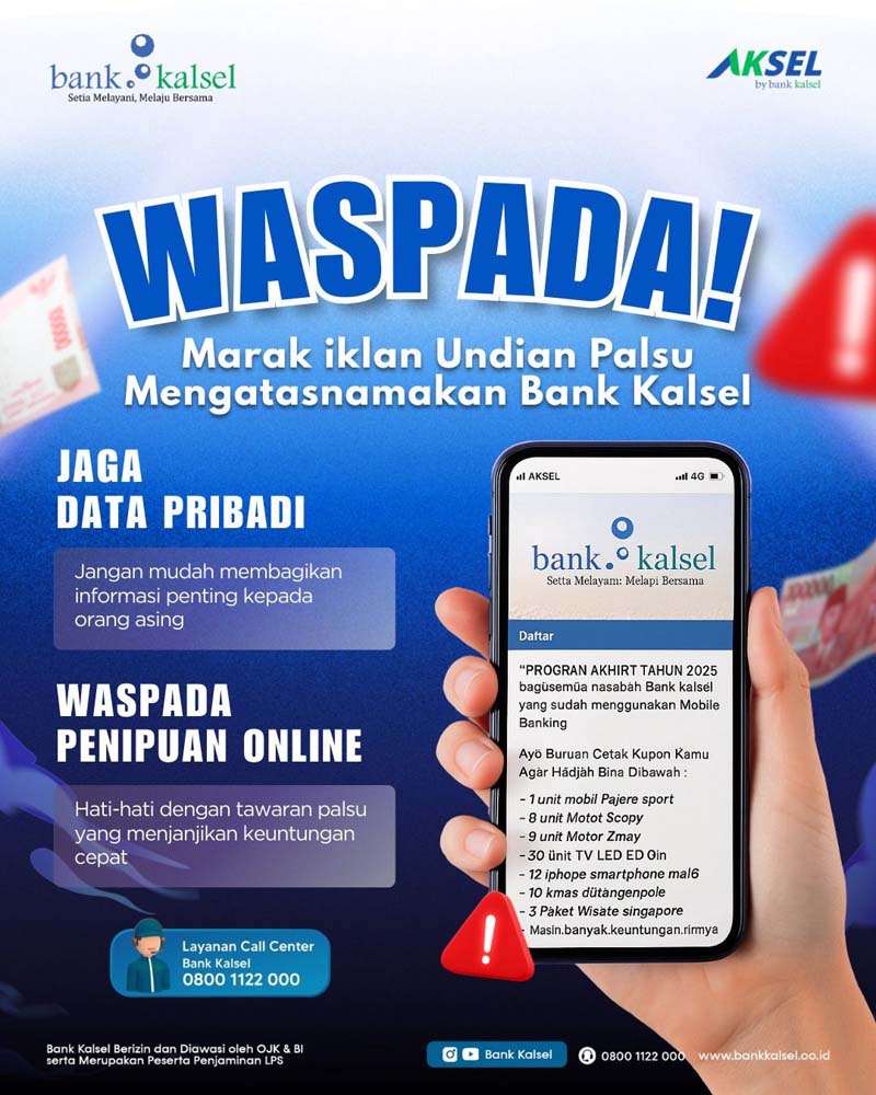 BANJARMASIN— Bank Kalsel mengimbau seluruh masyarakat dan nasabah untuk meningkatkan kewaspadaan terhadap maraknya aksi penipuan yang menggunakan modus undian berhadiah akhir tahun, seperti hadiah mobil, motor, barang elektronik, paket umrah, hingga hadiah uang tunai, yang mengatasnamakan Bank Kalsel.