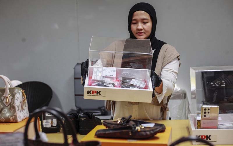 BARANG BUKTI – Petugas memperlihatkan sejumlah barang bukti hasil sitaan kasus korupsi yang akan dilelang di Rumah Penyimpanan Benda Sitaan Negara (Rupbasan) Komisi Pemberantasan Korupsi (KPK), Cawang, Jakarta, Rabu (26/11).