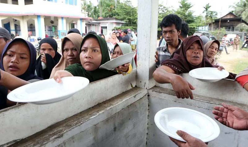 ANTRE – Warga antre untuk mengambil makan pagi di dapur umum bencana hidrometeorologi, Desa Raya Dagang, Pausangan, Bireuen, Aceh, Rabu (3/12). Pascabencana hidrometeorologi warga setempat bersama aparatur desa secara swadaya mendirikan dapur darurat di posko-posko pengungsian untuk membantu pemenuhan kebutuhan makanan bagi warga yang terdampak bencana alam di Kabupaten Bireuen.