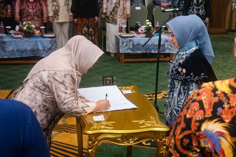 Prosesi pengukuhan ditandai pembacaan Surat Keputusan (SK) dan penandatanganan berita acara oleh Ketua Dekranasda Provinsi Kalimantan Selatan.