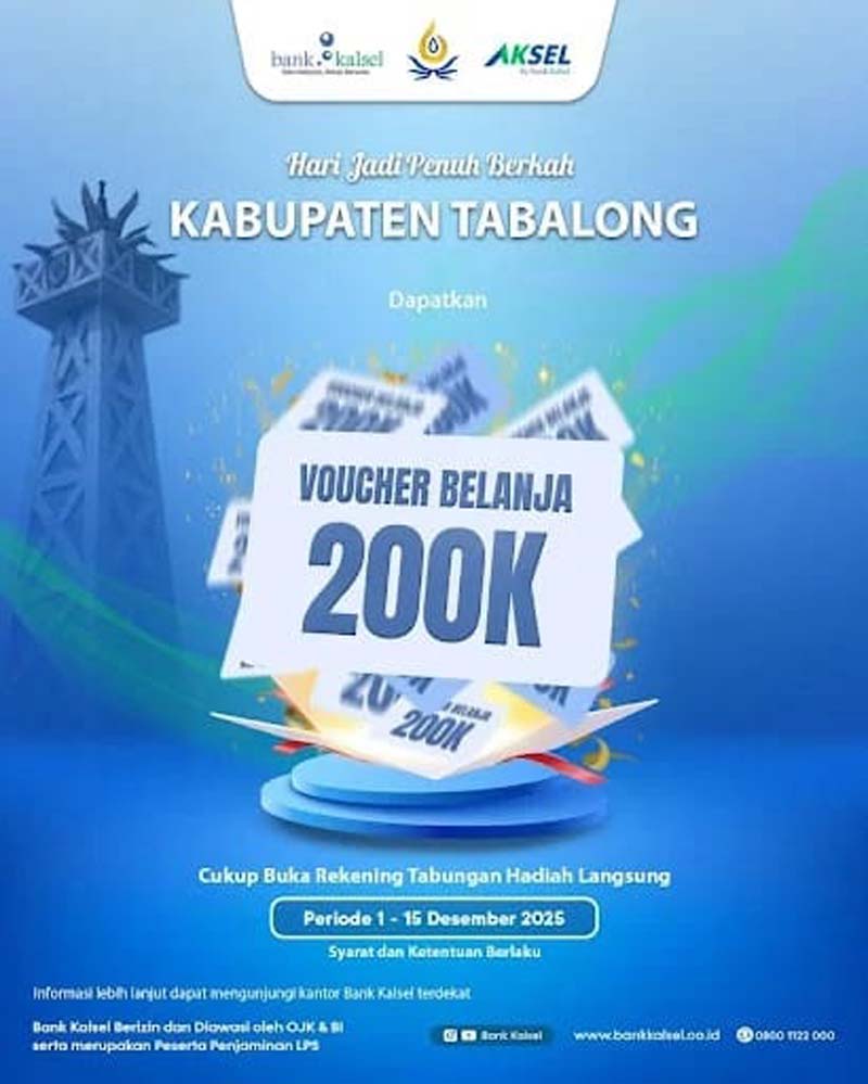 Melalui program tersebut, Bank Kalsel memberikan hadiah langsung berupa voucher belanja senilai Rp200.000 bagi nasabah yang membuka Tabungan Hadiah Langsung dengan jangka waktu minimal satu bulan dan setoran penempatan minimal Rp20 juta (syarat dan ketentuan berlaku). Promo ini berlangsung pada 1–15 Desember 2025 dan berlaku untuk nasabah Bank Kalsel Konvensional.
