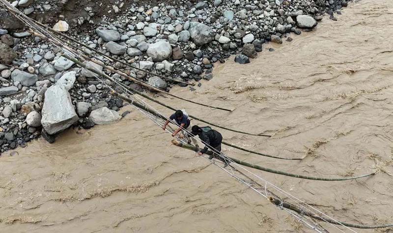 JEMBATAN DARURAT – Foto udara menunjukkan dua orang warga korban bencana yang terisolir melintasi Daerah Aliran Sungai (DAS) lewat jembatan tali darurat penghubung dari Desa Bergang Kecamatan Ketol, Aceh Tengah dan Desa Simpang Rahmat, Gajah Putih, Bener Meriah, Aceh, Senin (15/12). Berdasarkan data pos komando tanggap darurat bencana Aceh sebanyak 1.464 jiwa dari Desa Bergang, Karang Ampar dan Desa Pantan Reduk Kecamatan Ketol masih terisolir akibat akses jalan dan jembatan putus pasca bencana hidrometeorologi pada Rabu (26/11).