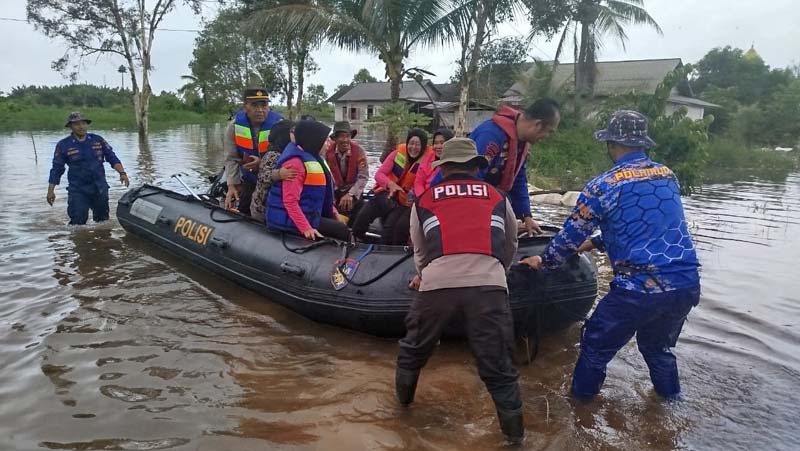 EVAKUASI – Polres Tala saat melakukan evakuasi terhadap warga terdampak banjir di Kecamatan Kurau, Jumat (2/1). Evakuasi dilakukan sebagai respons cepat atas meningkatnya debit air yang merendam permukiman warga akibat curah hujan yang tinggi dalam beberapa hari terakhir.