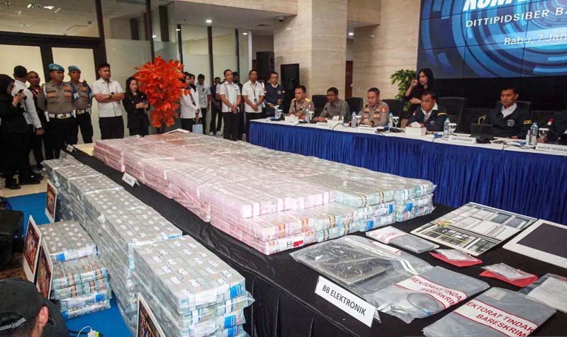 BARANG BUKTI – Sejumlah barang bukti ditampilkan saat konferensi pers terkait aksi ilegal dan pencucian uang judi online di Gedung Bareskrim Polri, Jakarta, Rabu (7/1). Direktorat Tindak Pidana Siber (Dittipidsiber) Bareskrim Polri membongkar kasus akses ilegal dan pencucian uang yang berasal dari praktik judi online (judol) dengan mengamankan lima orang tersangka serta menyita uang sebesar Rp 59 miliar.