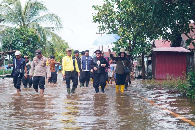 Setelah mengunjungi desa Marampiau, ketua TP PKK beserta rombongan meninjau masyarakat terdampak banjir di Dusun Thaibah, Kecamatan Tapin Utara.