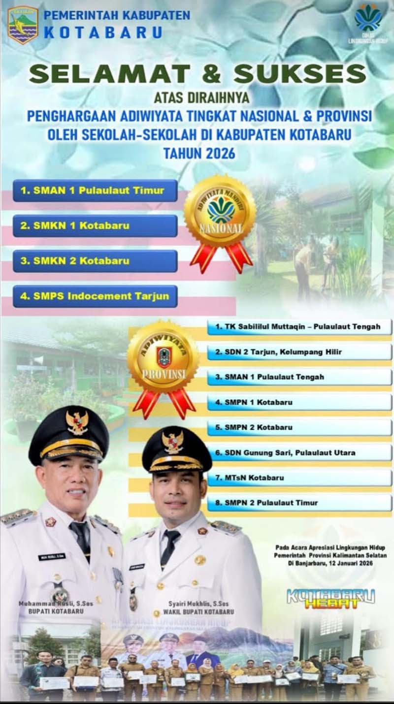 Penghargaan tersebut diterima langsung oleh Sekolah terkait dengan didampingi Kepala Dinas Lingkungam Hidup Kotabaru Hj. Melinda Ratna Agustina, S. STP, M. IP di Kantor Dinas Lingkungam Hidup Provinsi Kalimantan Selatan, Senin (12/01/2026).