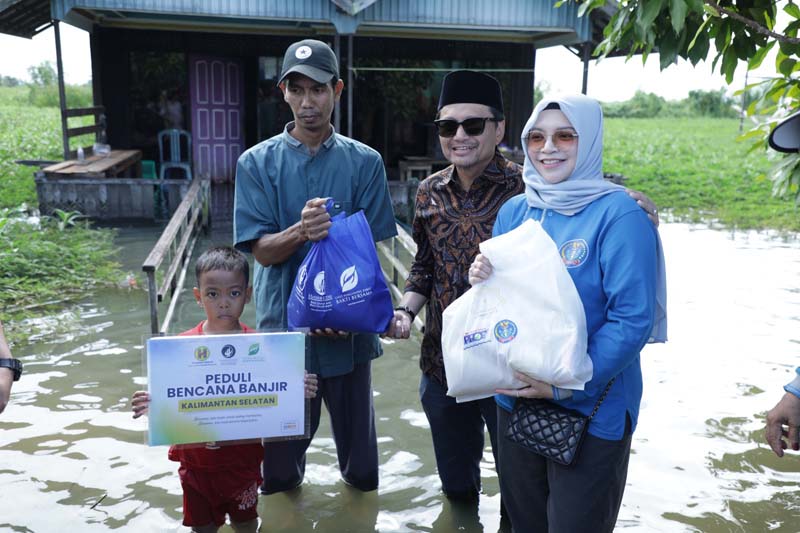 Wakil Gubernur (Wagub) Kalimantan Selatan, Hasnuryadi Sulaiman bersama Ketua BKOW Kalsel, drg Hj Ellyana Trisya Hasnuryadi saat menyerahkan bantuan kepada korban terdampak bencana alam banjir di Desa Sungai Rangas Ulu, Kecamatan Martapura Barat, Kabupaten Banjar