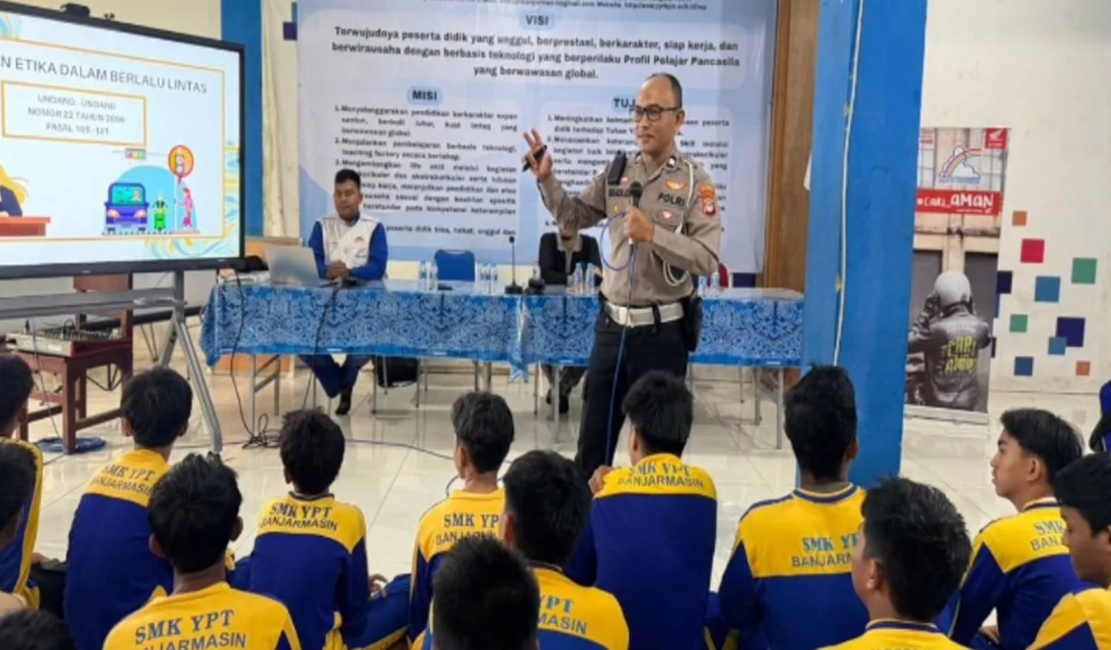 BANJARMASIN – Satlantas Polresta Banjarmasin, jajaran Polda Kalimantan Selatan (Kalsel), kembali melaksanakan edukasi pelajar melalui kegiatan Police Goes to School dan Polantas Menyapa di lingkungan Sekolah Menengah Kejuruan Swasta Yayasan Pelita Edu Teknika (SMKS YPT) Banjarmasin, Jalan Rawasari Ujung, pada Jumat pagi.