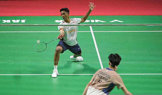 Pebulu tangkis tunggal putra Indonesia Alwi Farhan (atas) mengembalikan kok ke arah lawannya asal Thailand, Panitchaphon Teeraratsakul pada final Daihatsu Indonesia Masters 2026 di Istora Senayan, Jakarta, Minggu (25/1).(foto:mb/ant)