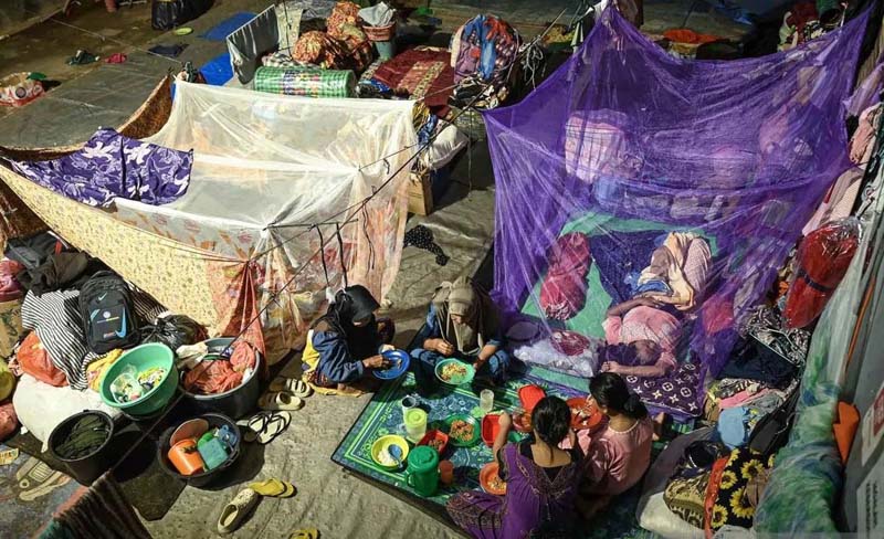 SAHUR BERSAMA – Warga penyintas bencana hidrometeorologi makan sahur bersama di posko pengungsian Desa Batu Hula, Batang Toru, Tapanuli Selatan, Sumatera Utara, Kamis (19/2). Sebanyak 16 KK asal Desa Huta Godang yang masih mengungsi mendapatkan makanan sahur dari dapur umum pengungsian untuk menjalankan Ibadah Puasa Ramadhan 1447 H.