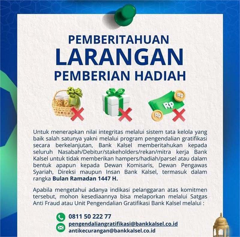 Bank Kalsel menghimbau kepada seluruh nasabah, debitur, stakeholders, serta mitra kerja agar tidak memberikan hampers, parsel, uang, maupun hadiah dalam bentuk apa pun kepada Dewan Komisaris, Dewan Pengawas Syariah, Direksi, dan seluruh insan Bank Kalsel.