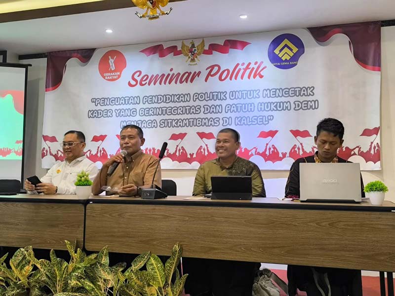 BANJARMASIN – Dewan Pimpinan Wilayah (DPW) Partai Gerakan Rakyat Kalimantan Selatan bersama DPW Partai Gerakan Mandiri Bangsa (GEMA Bangsa) Kalimantan Selatan berkolaborasi dengan Direktorat Intelijen dan Keamanan (Dit Intelkam) Polda Kalsel menggelar Seminar Politik bertema “Penguatan Pendidikan Politik untuk Mencetak Kader yang Berintegritas dan Patuh Hukum demi Menjaga Sitkamtibmas di Wilayah Kalsel”, Minggu (22/2).