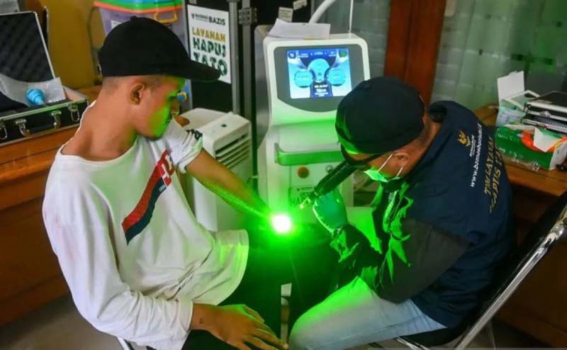 HAPUS TATO – Petugas medis menggunakan alat laser menghapus tato seorang peserta di Masjid Sunda Kelapa, Jakarta, Senin (23/2). Badan Amil Zakat Nasional (Baznas)/ Baziz DKI Jakarta menggelar program layanan hapus foto gratis dengan menargetkan sekitar 700 peserta selama bulan Ramdhan dari 23 Februari sampai 3 Maret 2026.