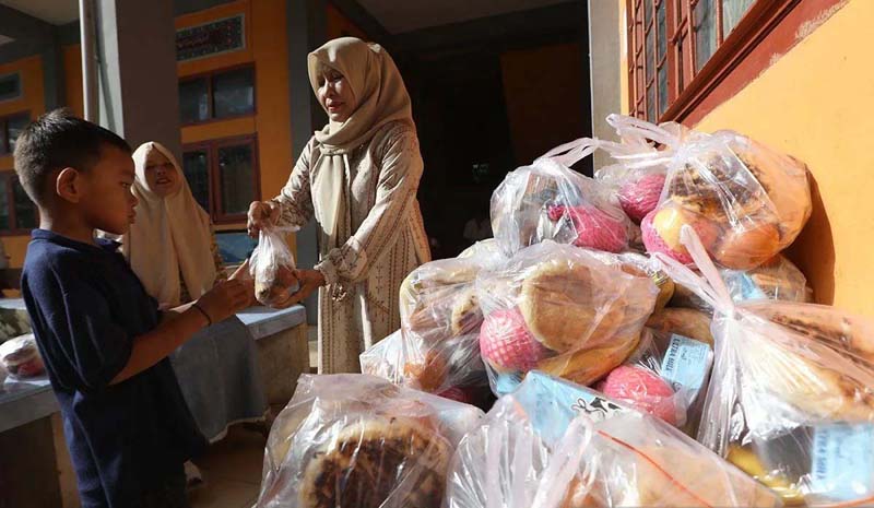 TERIMA PAKET – Pelajar (kiri) menerima paket Makanan Bergizi Gratis (MBG) bulan Ramadhan yang diserahkan tenaga pendidik di SD Negeri 56, Banda Aceh, Aceh, Selasa (24/2). Badan Gizi Nasional (BGN) bersama Satuan Pelayanan Pemenuhan Gizi (SPPG) dan pemerintah daerah telah menyepakati menu MBG untuk pelajar selama Ramadhan 2026 di Provinsi Aceh dialihkan jadi menu kering yang penyalurannya disesuaikan dengan kearifan budaya, adat, kebiasaan dan hukum yang berlaku.
