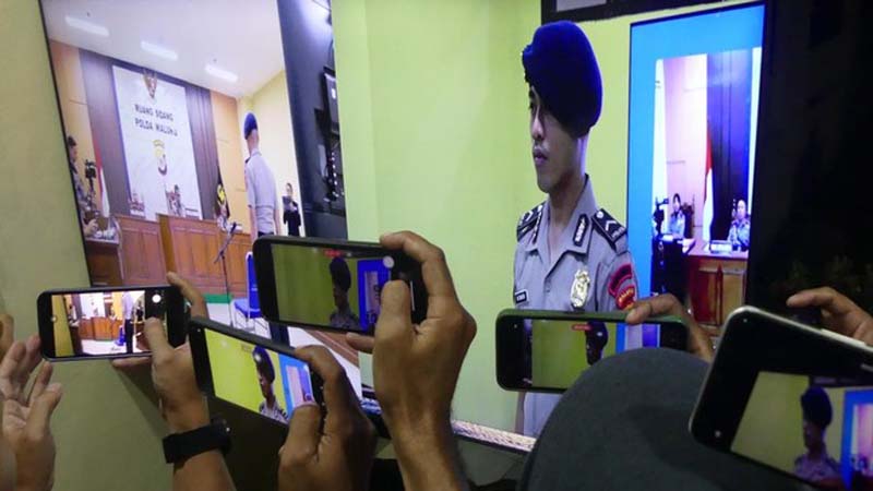 SEJUMLAH wartawan merekam layar monitor yang menyiarkan Sidang Komisi Kode Etik Profesi (KKEP) Polri dengan tersangka Bripda Mesias Viktor Siahaya di Mapolda Maluku, Ambon, Maluku, Selasa (24/2).
