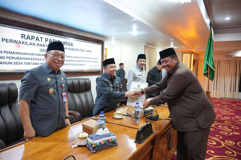 RANTAU,- Bupati Tapin H Yamani bersama Wakil Bupati H Juanda, menghadiri rapat paripurna DPRD Kabupaten Tapin, dengan agenda penyampaian dan pemandangan umum Fraksi – Fraksi DPRD Kabupaten Tapin, terhadap Ranperda tentang perubahan kedua atas peraturan daerah kabupaten Tapin No.1 tahun 2024 tentang pajak daerah dan retribusi daerah, bertempat di aula rapat DPRD Tapin, Rabu (25/02/26).