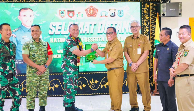 AMUNTAI-Bupati HSU H Sahrujani dan Wakil Bupati HSU Hero Setiawan, menyambut kedatangan rombongan Ketua Tim Pengawasan dan Evaluasi (Wasev), TMMD Kolonel Inf Amrullah di Mess Negara Dipa Kabupaten Hulu Sungai Utara (HSU).