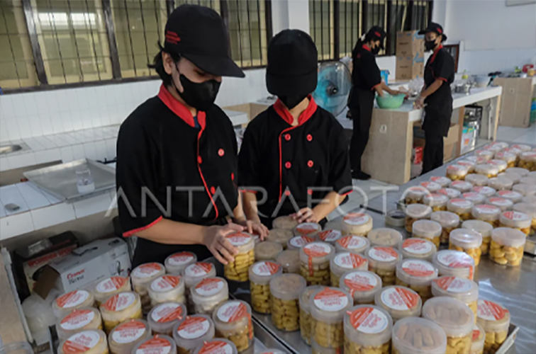 PRODUKSI KUE LEBARAN – Tibanya Ramadhan mendatangkan berkah juga bagi siswa yang mengambil jurusan tata boga. Para siswa membuat kue kering di SMK Marsudirini Marganingsih, Solo. Berbagai kue kering seperti kue nastar, semprit, dan kastengel untuk kebutuhan Lebaran yang diproduksi para siswa ini banyak diminati pembeli hingga dari luar Kota Solo dan hanya membatasi pemesanan sampai H-7 Lebaran.
