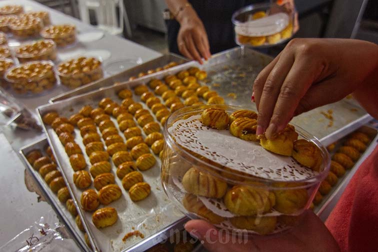 PRODUKSI KUE KERING – Usaha kue kering ini sudah berdiri selama 60 tahun dan penjualan kue hanya bisa ditemui pada momen menjelang lebaran dengan produksi rata-ata per hari mencapai 5.000 kilogram kue dengan berbagai cinta rasa yang khas yakni nastar nanas, kue kenari, kue kacang, kue semprit, kue aster, spekulas, cornflakes, skippy, petak coklat, kue koya dan cake. Para pekerja melakukan proses packing kue di dapur produksi Kue Kering Rose di Kota Padang, Sumatra Barat.