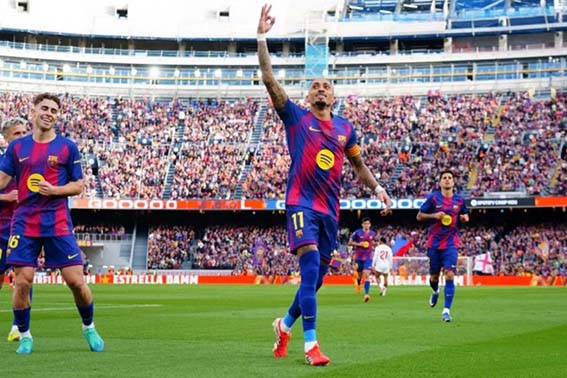 Selain tiga gol dari Raphinha, Barcelona mencetak kemenangan berkat gol Dani Olmo dan Joao Cancelo, sedangkan Sevilla sempat memperkecil ketertinggalan melalui Oso serta Djibril Sow, demikian catatan La Liga.