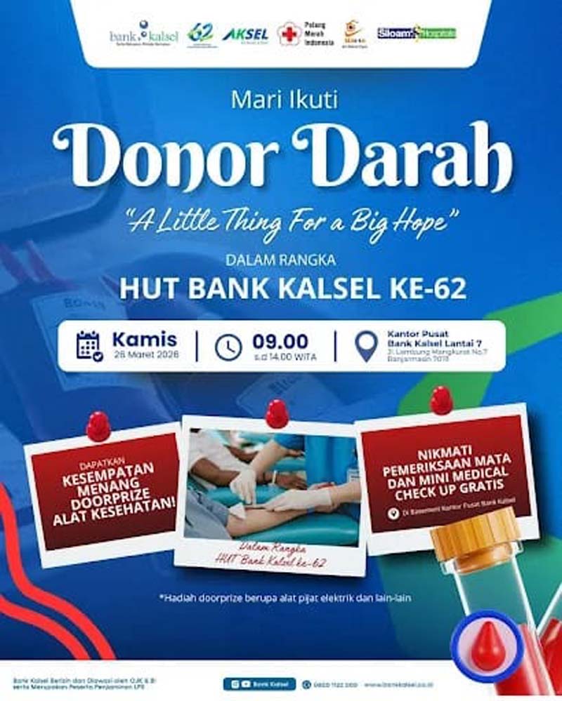 BANJARMASIN – Dalam rangka memperingati Hari Ulang Tahun (HUT) ke-62, Bank Kalsel menggelar kegiatan donor darah bertema “A Little Thing For a Big Hope”.