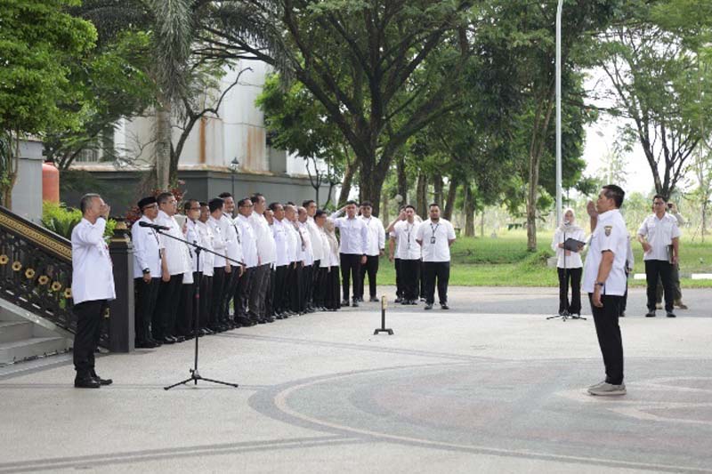 BANJARBARU – Suasana penuh semangat dan kebersamaan mewarnai apel pagi perdana di lingkungan Sekretariat Daerah Provinsi Kalimantan Selatan usai libur Hari Raya Idul Fitri 1447 Hijriah di halaman Kantor Gubernur Kalsel, di Banjarbaru, Rabu (25/3).