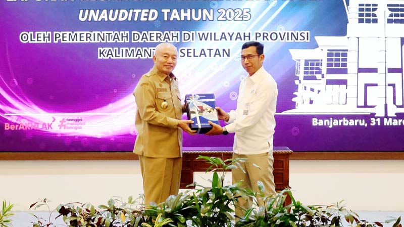 BANJARBARU – Gubernur Kalimantan Selatan H Muhidin didampingi Sekdaprov Muhammad Syarifuddin menyerahan Laporan Keuangan Pemerintah Daerah (LKPD) Unaudited tahun 2025 kepada Badan Pemeriksa Keuangan (BPK) RI Perwakilan Provinsi Kalsel, di Banjarbaru, Selasa (31/3).