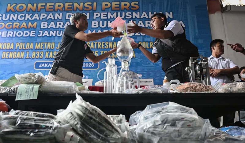 BARANG BUKTI – Anggota polisi menata barang bukti narkoba sebelum rilis pengungkapan kasus narkotika di Direktorat Raserse Narkoba Polda Metro Jaya, Jakarta, Rabu (8/4). Direktorat Reserse Narkoba Polda Metro Jaya mengungkap 1.833 kasus narkoba selama Januari-Maret 2026 dan memusnahkan 721,01 kilogram barang bukti berbagai jenis narkoba senilai Rp820 miliar.