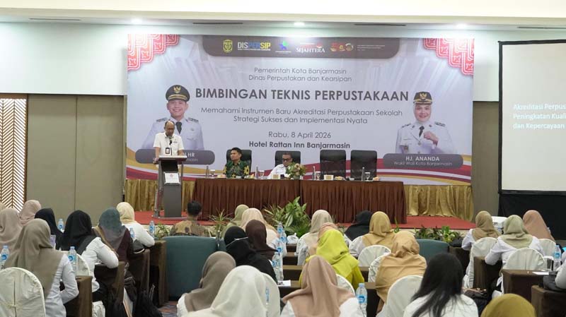 BANJARMASIN– Pemerintah Kota Banjarmasin melalui Dinas Perpustakaan dan Kearsipan (Dispersip) melaksanakan kegiatan Bimbingan Teknis (Bimtek) Perpustakaan Tahun 2026 dengan tema “Memahami Instrumen Baru Akreditasi Perpustakaan Sekolah: Strategi Sukses dan Implementasi Nyata”, Rabu (08/04), di Hotel Rattan Inn Banjarmasin.