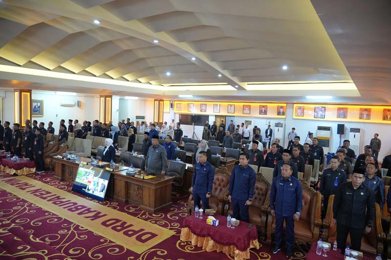 ANGGARAN-Rapat paripurna DPRD Kabupaten Tapin dengan dua agenda acara yakni penyampaian rekomendasi DPRD terhadap laporan keterangan pertanggungjawaban (LKPJ) bupati Tapin tahun anggaran 2025 dan sekaligus penyampaian pendapat fraksi – fraksi DPRD Tapin terhadap rancangan peraturan daerah (Ranperda) tentang perubahan kedua atas Perda Tapin o.01 tahun 2024 tentang pajak dan retribusi daerah. (foto:mb/herman)